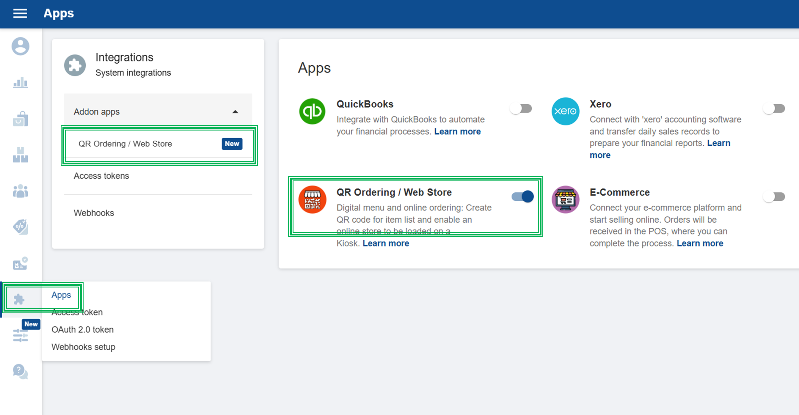 (Once you tick ON “QR Ordering”, it will appear as a sub-menu in the Integrations section)