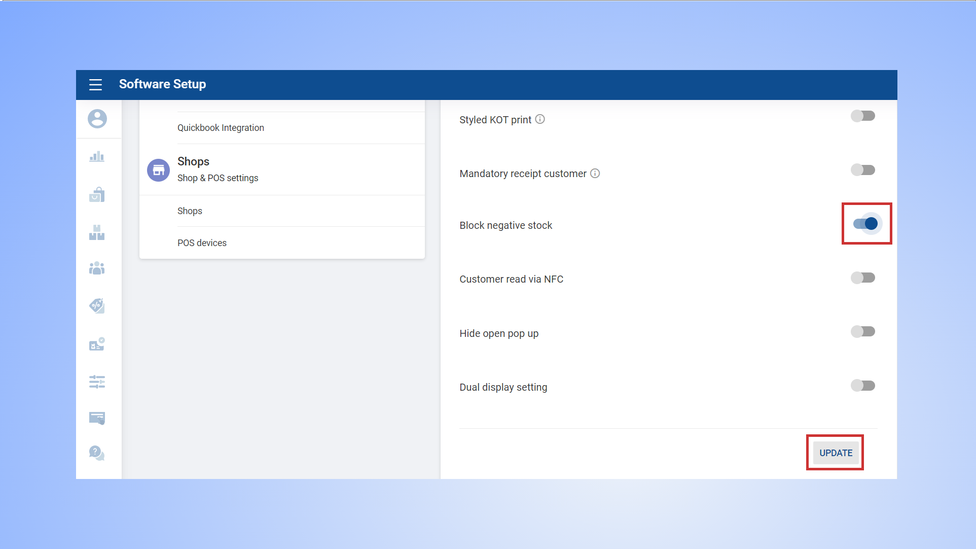 (Once you ON “Block negative stock ”, you cannot do the sales with negative stocks on item.)