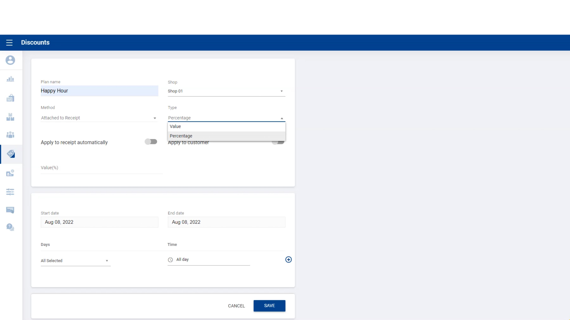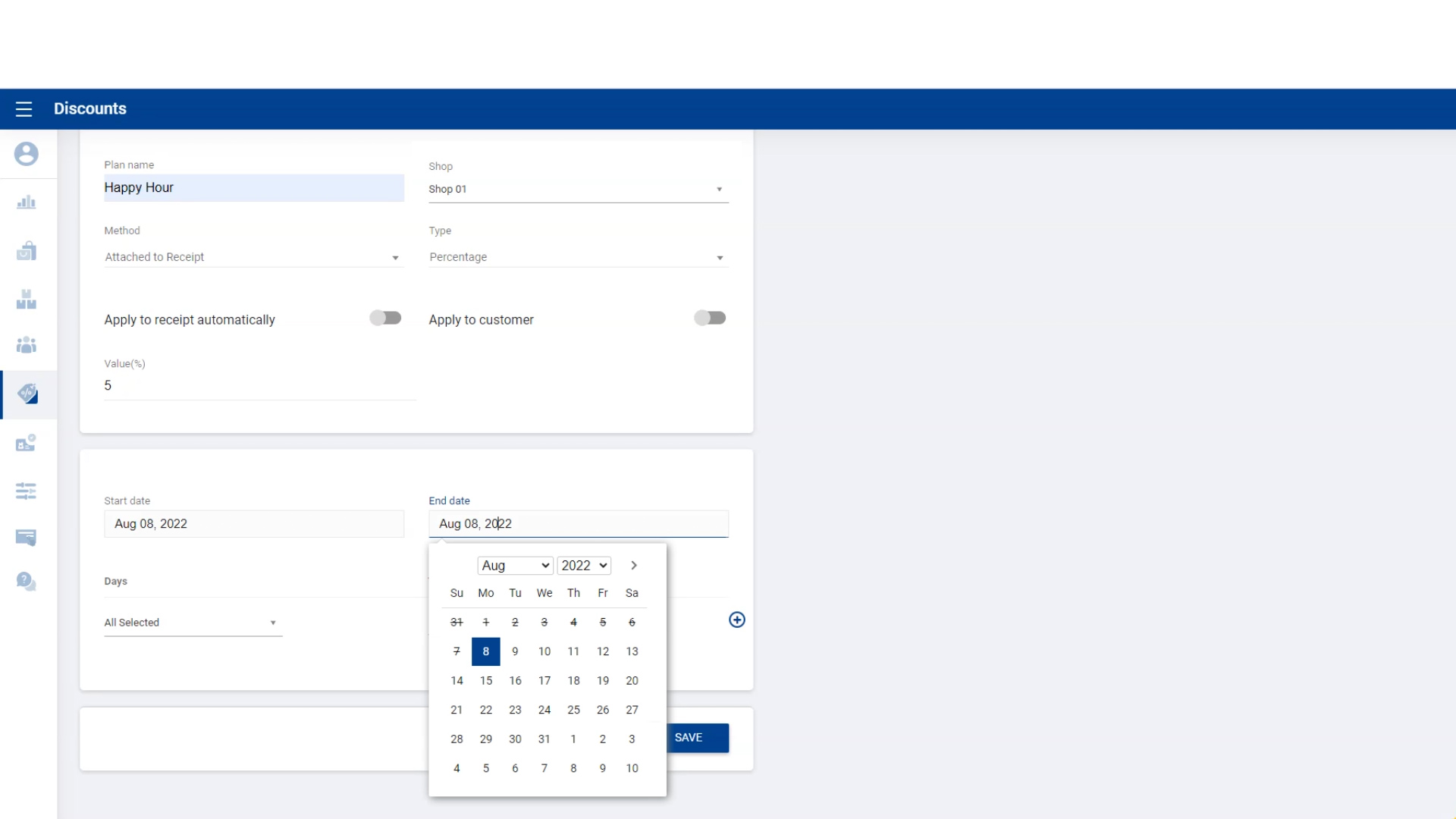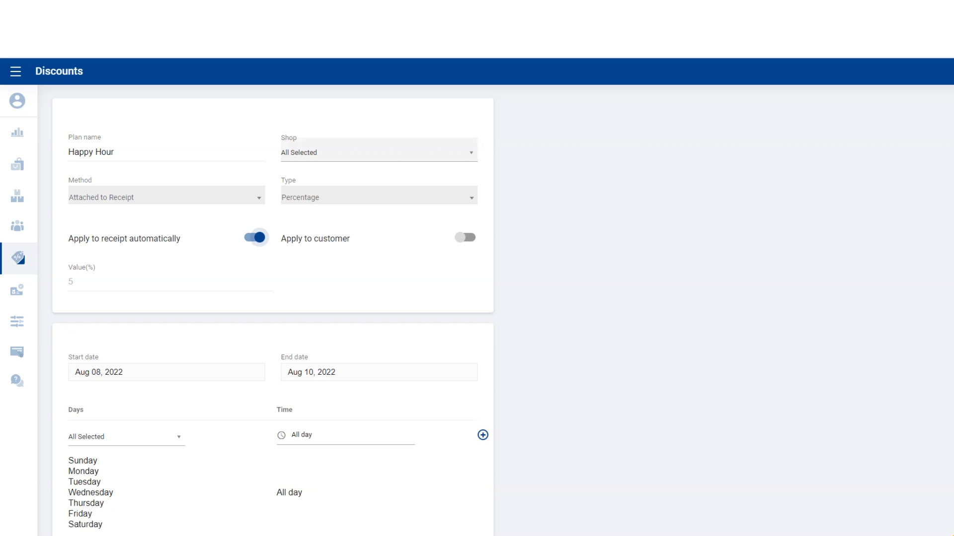 Login to SalesPlay POS Back Office >Select 'Promotions' from main menu.> Go to the 'Discounts'.