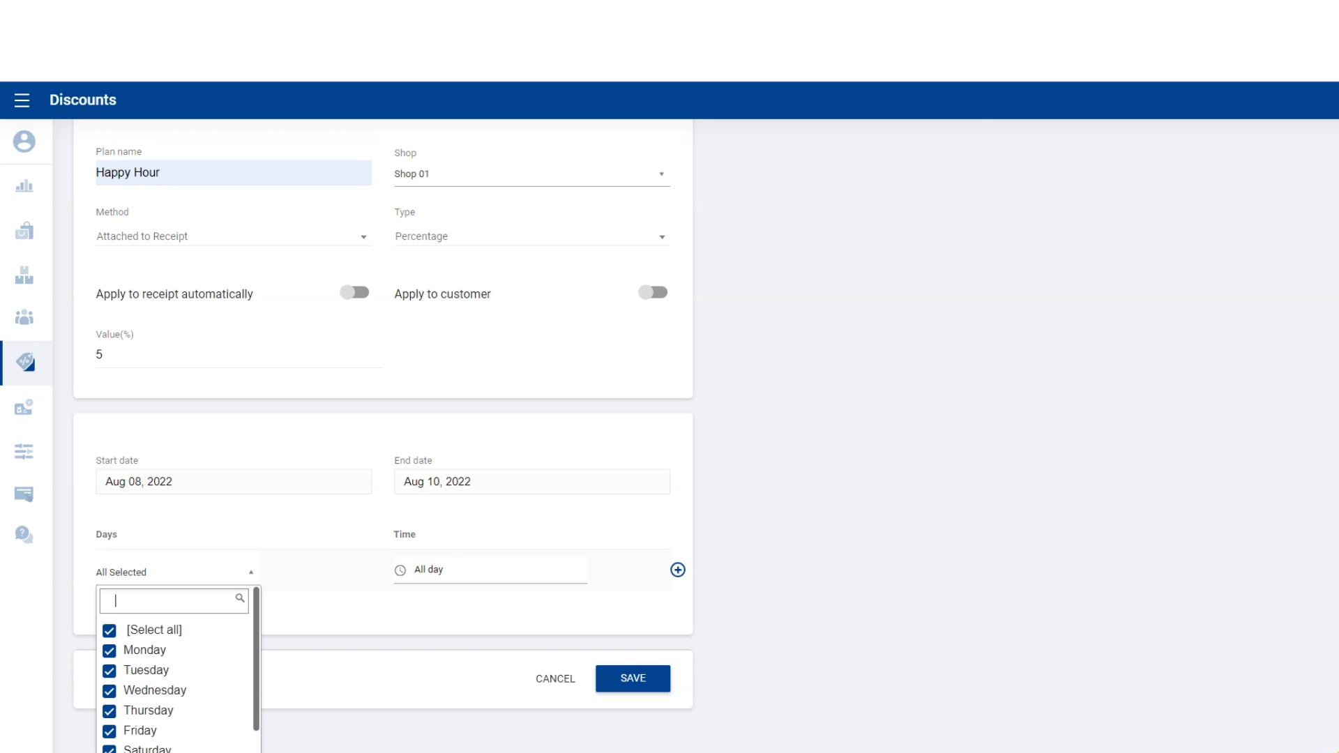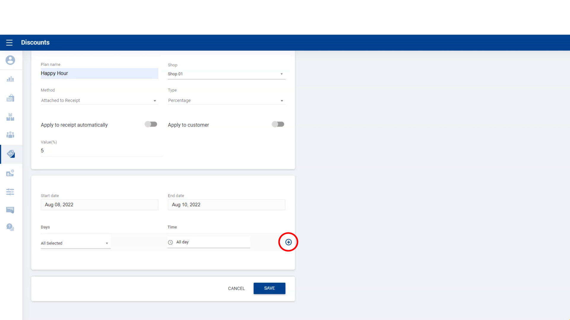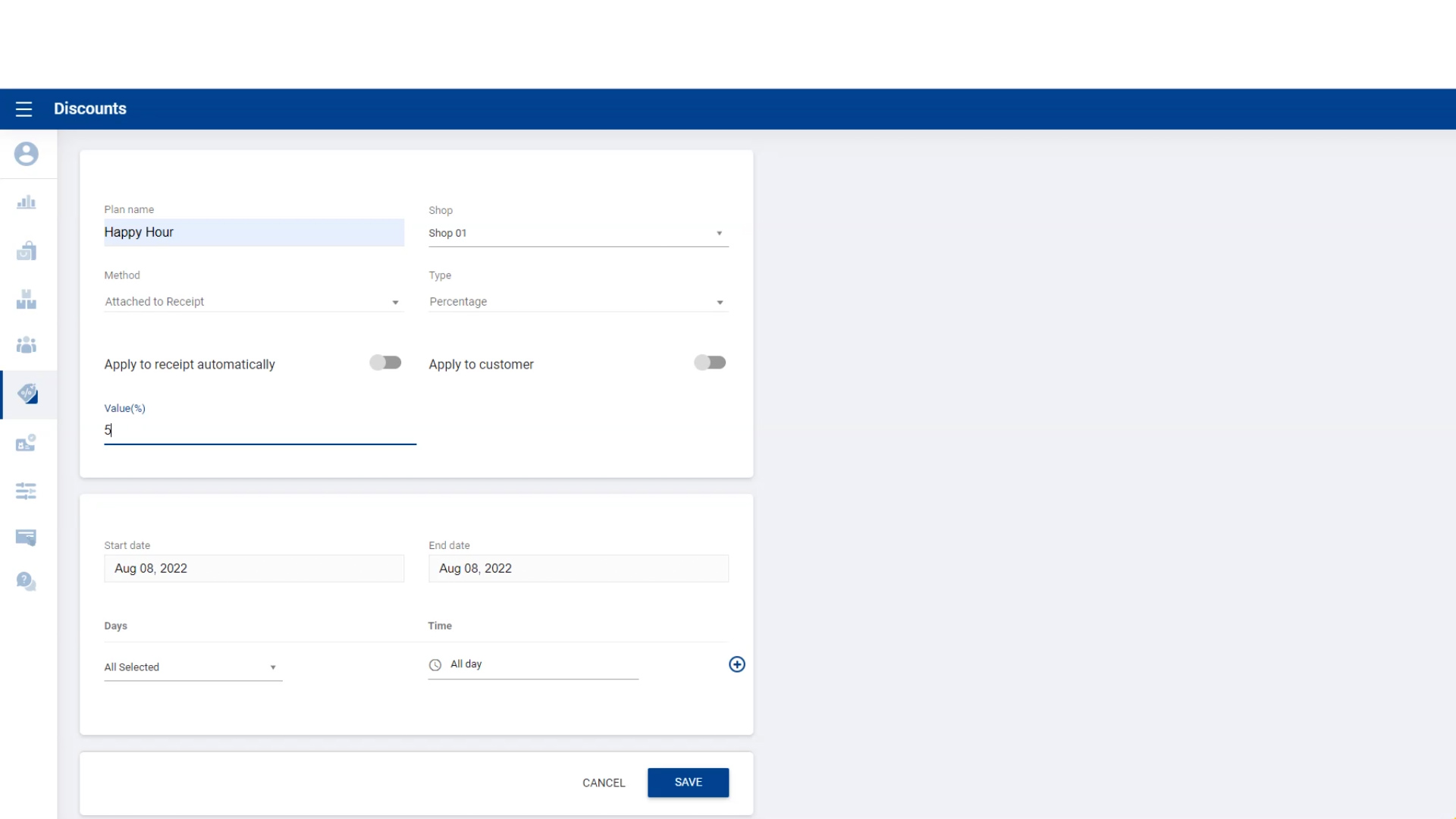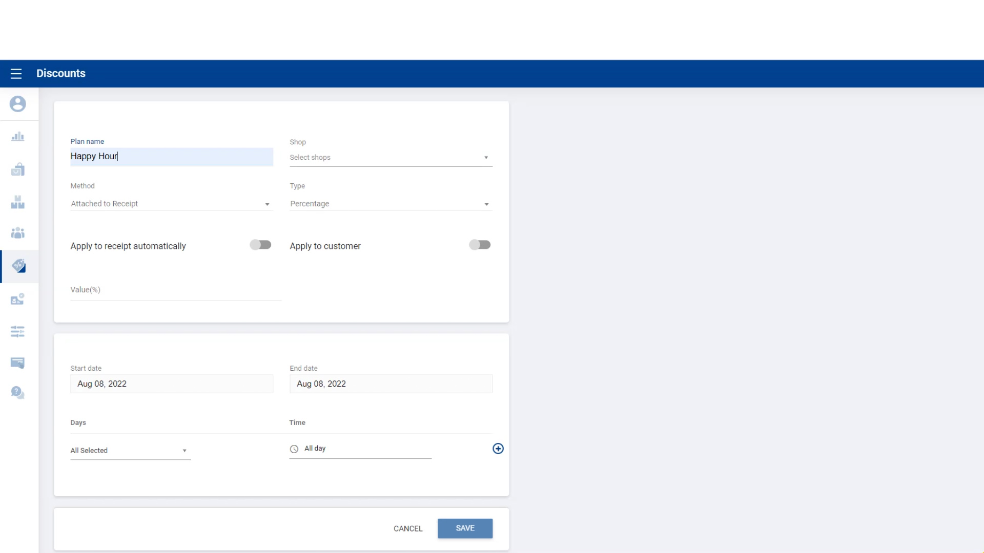 Login to SalesPlay POS Back Office >Select 'Promotions' from main menu.> Go to the 'Discounts'.
