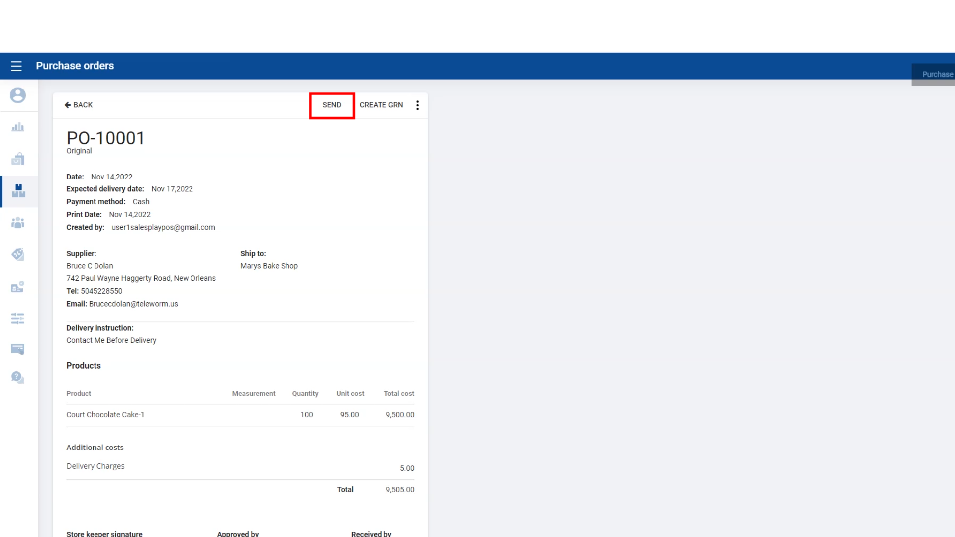 Once click CREATE, you will be redirected to another page, where you can Print, Download or send the PO via Email to the supplier.