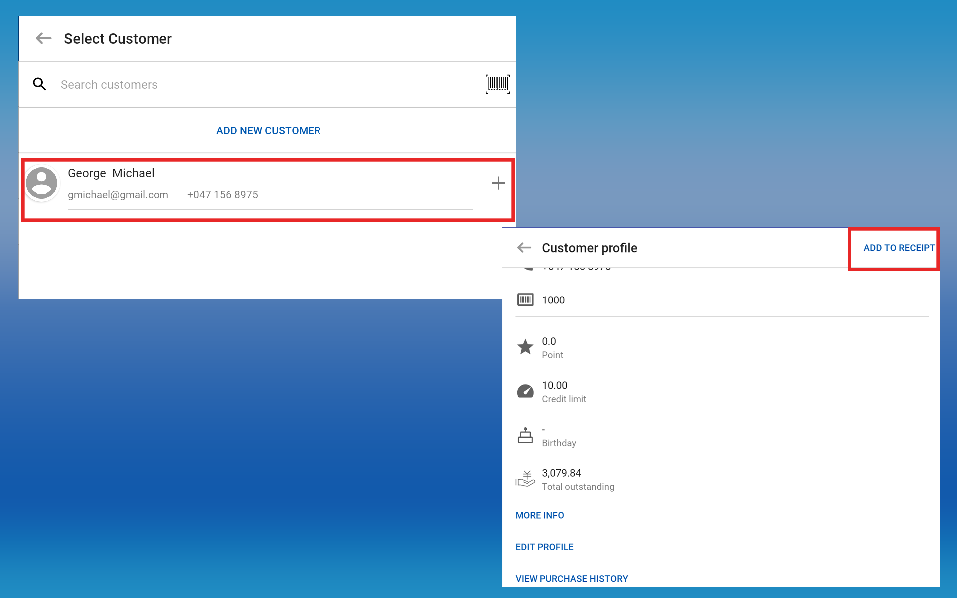 3. Select the customer and go to the profile section > Click on the “ADD TO RECEIPT” section