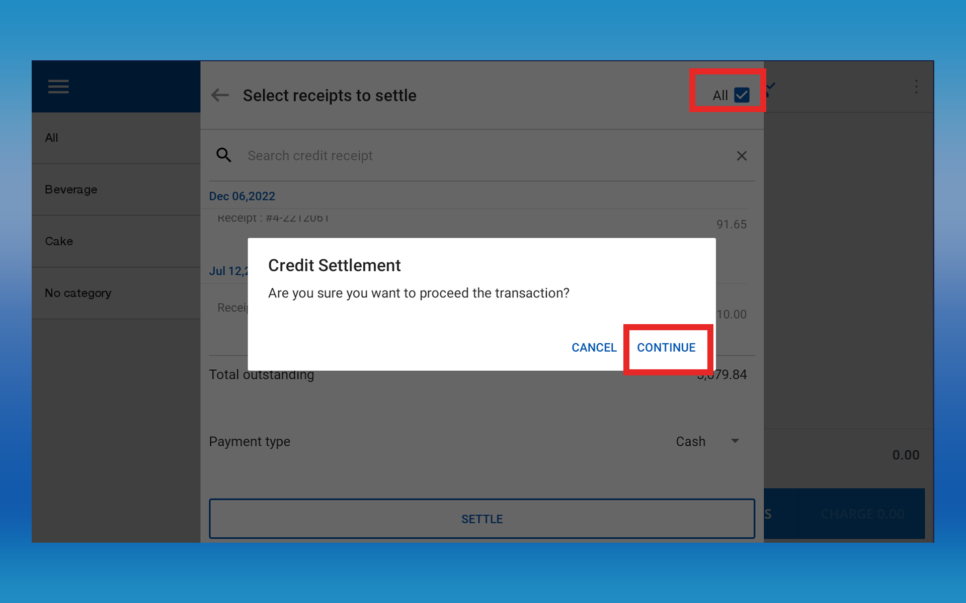 6. Click the “Continue “ button (Once the user has done the full/partial credit settlement, customer outstanding will be reduced from the “Debtor Management” section and settlements will be shown in “Shift End” reports.