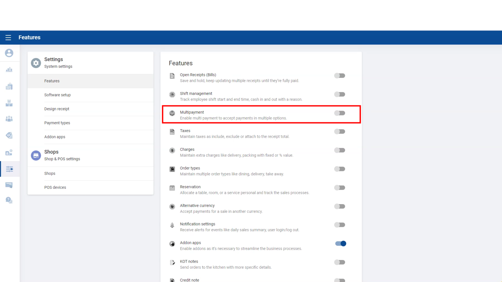 (Once you turn on “Multipayment”, already created payment types will downloaded to the POS App payment interface.)