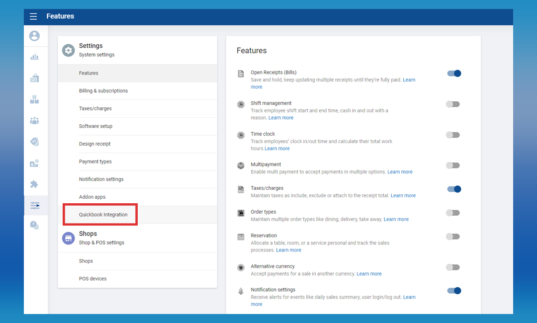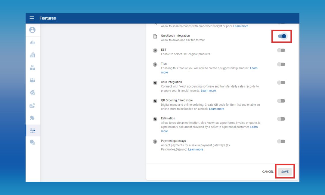 (Once you ON “Quickbook Integration”, it will appear as a sub-menu in the Settings section)
