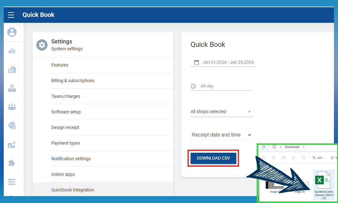 SalesPlay POS system offers seamless integration with QuickBooks accounting and bookkeeping software. This integration enables you to download receipts in CSV format and easily upload them to QuickBooks.