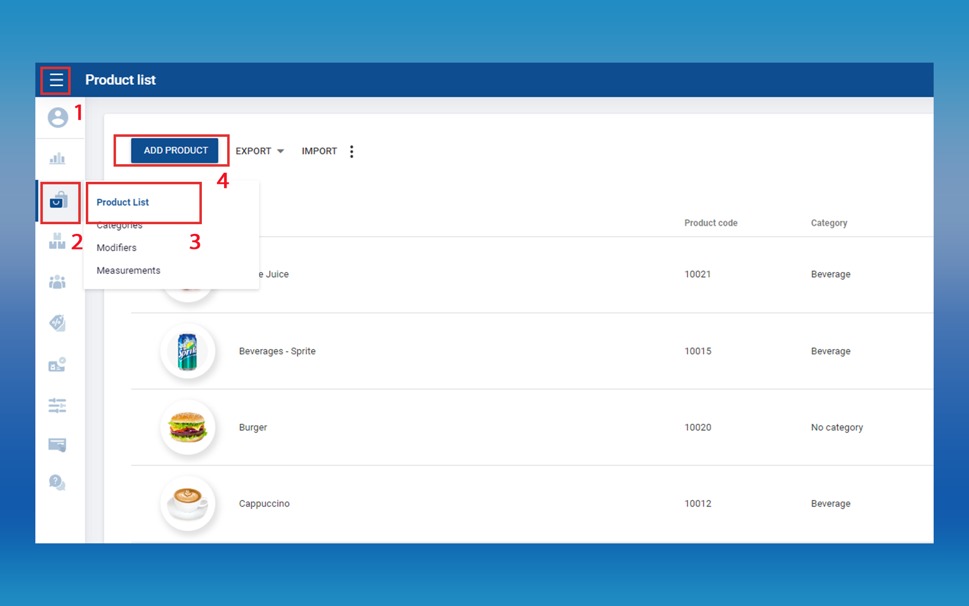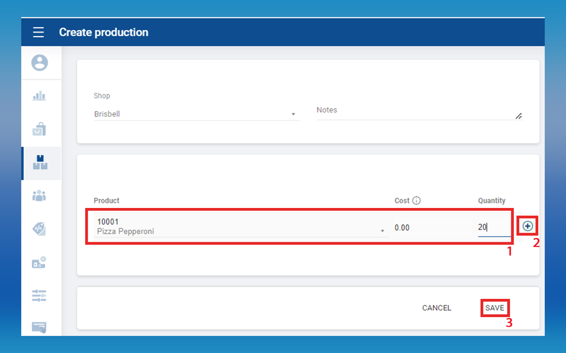 The restaurant offers a burger that consists of a bun, patty, tomato, and sauce. When the kitchen prepared burgers POS system allows entering the quantity of the finished goods under the production feature.