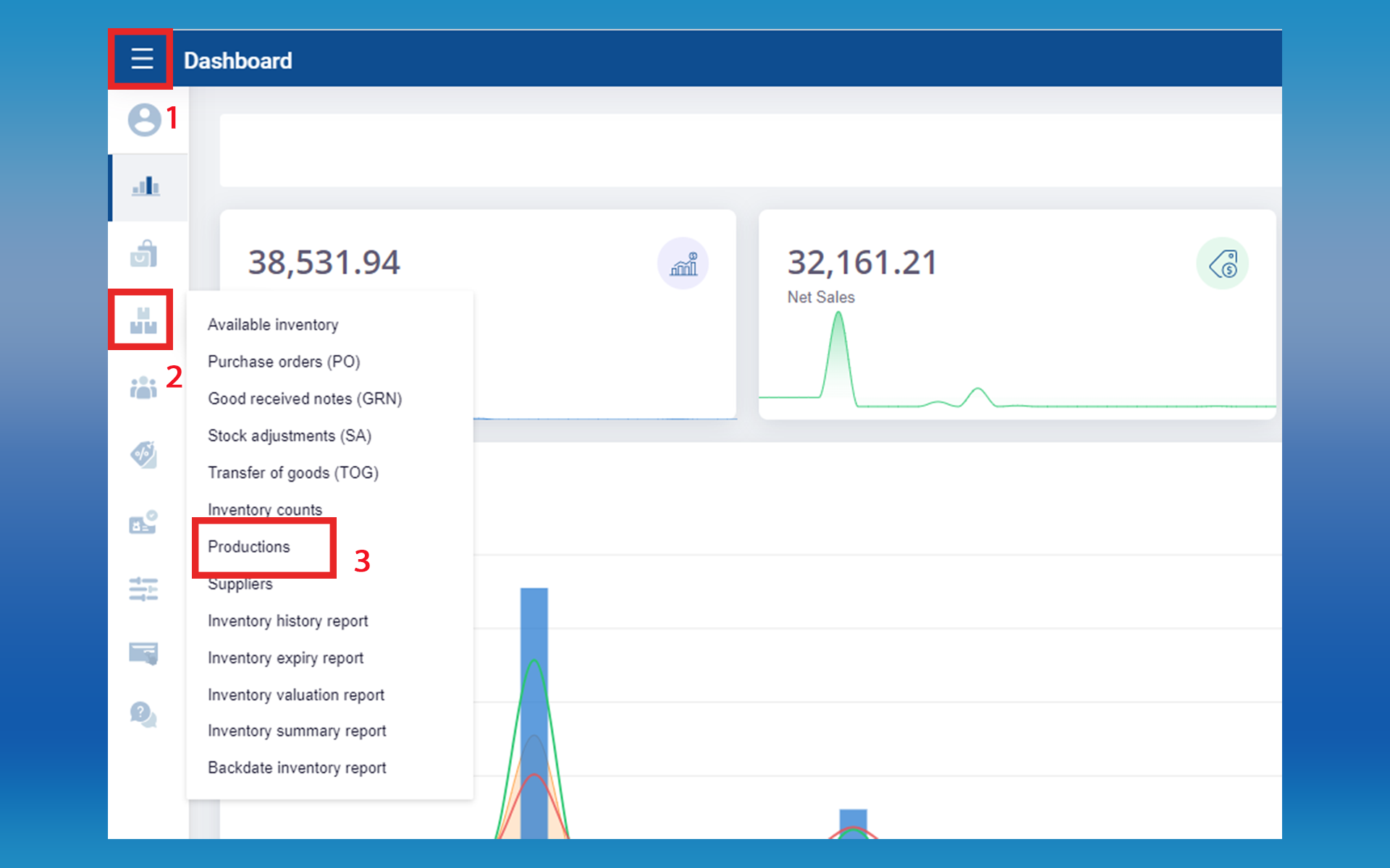 In the 'Production' function, let's consider the example of preparing chicken fried rice using ingredients such as chicken, rice, and carrots. For each serving of fried rice, you require 100g of rice, 25g of chicken, and 10g of carrots. Once the preparation is complete, you can easily enter the quantity of fried rice packets you made based on the available stocks. Let's say you prepared 20 packets of fried rice; the 'Production' feature allows you to record this quantity accurately in the system. This way, you can efficiently manage your inventory and keep track of the usage of raw materials while ensuring your finished goods are well accounted for.